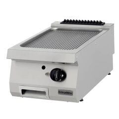 • Pişirme yüzeyinin altında paslanmaz çelikten yapılmış brülörler mevcuttur. Termostatik gaz valfi ile kontrol edilen pişirme yüzey sıcaklığı 100-300 °C arasında ayarlanabilmektedir. Bu da optimum gaz tüketimi ve yüzeyde istenilen sıcaklık dağılımını sağlamaktadır.